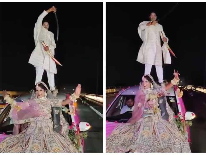 अब कार पर खतरनाक स्टंट करते हुए दूल्हा दुल्हन का वीडियो सोशल मीडिया पर वायरल हो रहा है। वीडियो में दिखाई दे रहा है कि दुल्हन कार के बोनट पर बैठी डांस कर रही है। दूसरी ओर दूल्हा कार की छत पर खड़ा होकर तलवार लहरा रहा है। यह घटना हाल में हुई एक शादी के बाद की बताई जा रही है। हालांकि लाइव हिन्दुस्तान इस वायरल वीडियो की सत्यता की पुष्टि नहीं कर रहा है।