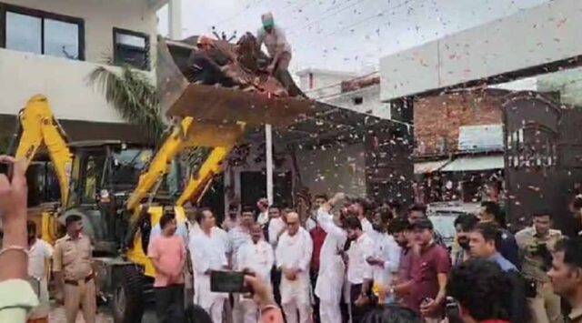 योगी सरकार में गुंडों और माफिया पर कार्रवाई का प्रतीक बन चुके बुलडोजर से फूल बरसाकर कांग्रेस के प्रदेश अध्यक्ष अजय राय का झांसी आगमन पर स्वागत किया गया।