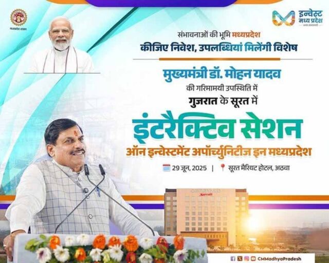 औद्योगिक नीति एवं निवेश प्रोत्साहन विभाग द्वारा आयोजित यह कार्यक्रम दक्षिण गुजरात के सशक्त औद्योगिक तंत्र से मध्यप्रदेश की रणनीतिक साझेदारी को सशक्त बनाने और राज्य को निवेश के लिए एक विश्वसनीय गंतव्य के रूप में स्थापित करने की दिशा में एक महत्वपूर्ण कदम है। इसमें प्रमुख उद्योग समूहों के प्रतिनिधियों, वरिष्ठ कॉर्पोरेट नेताओं और उद्योग संगठनों की भागीदारी रहेगी। कार्यक्रम में साउथ गुजरात जोनल काउंसिल के चेयरमैन एवं प्रवीन लैबोरेट्रीज़ प्रा. लि. के निदेशक श्री हेतुल मेहता स्वागत भाषण देंगे। मध्यप्रदेश की औद्योगिक क्षमताओं, अधोसंरचना और नीतिगत नवाचारों पर केन्द्रित फिल्म ‘इनफिनिट पॉसिबिलिटीज इन एमपी’ का प्रदर्शन किया जाएगा।